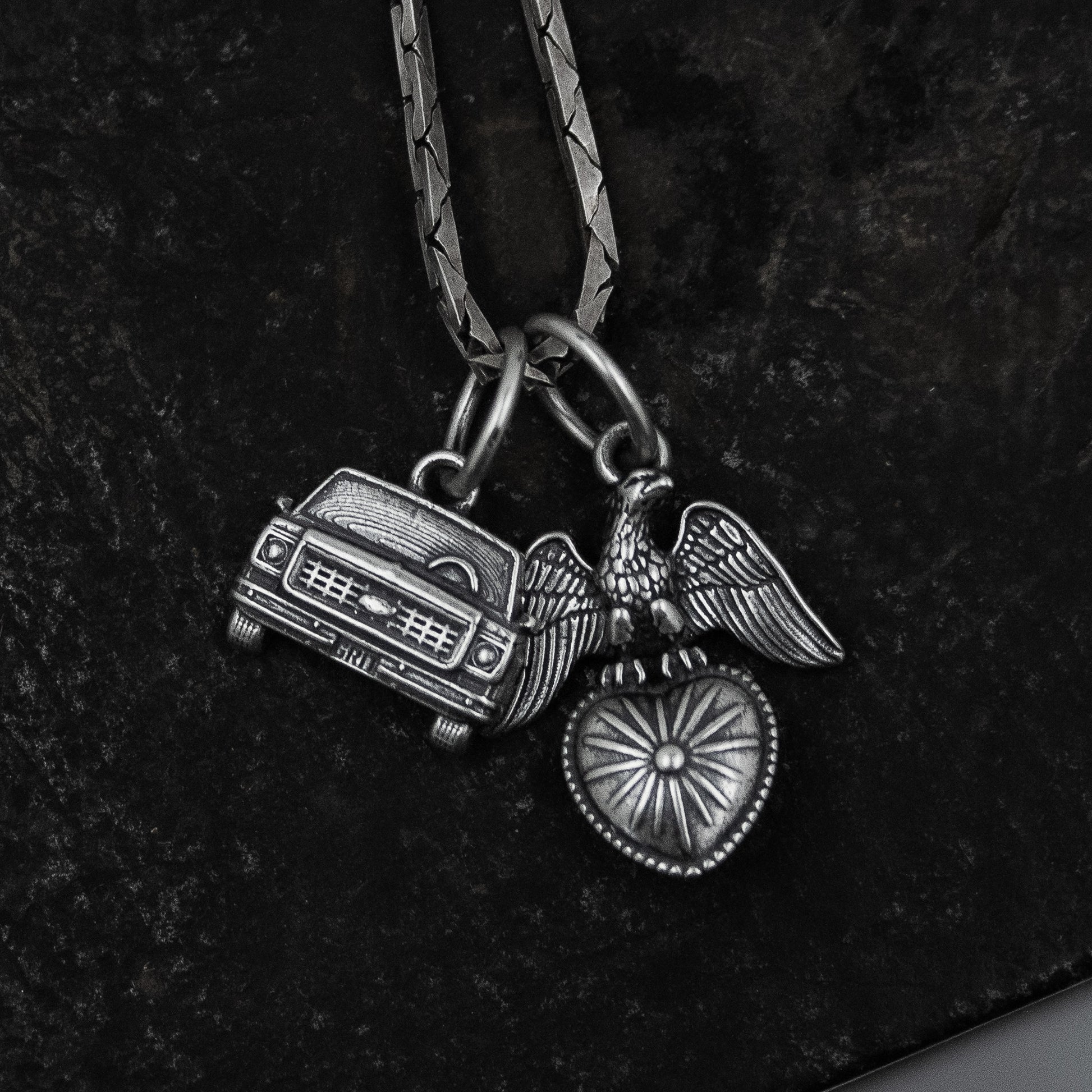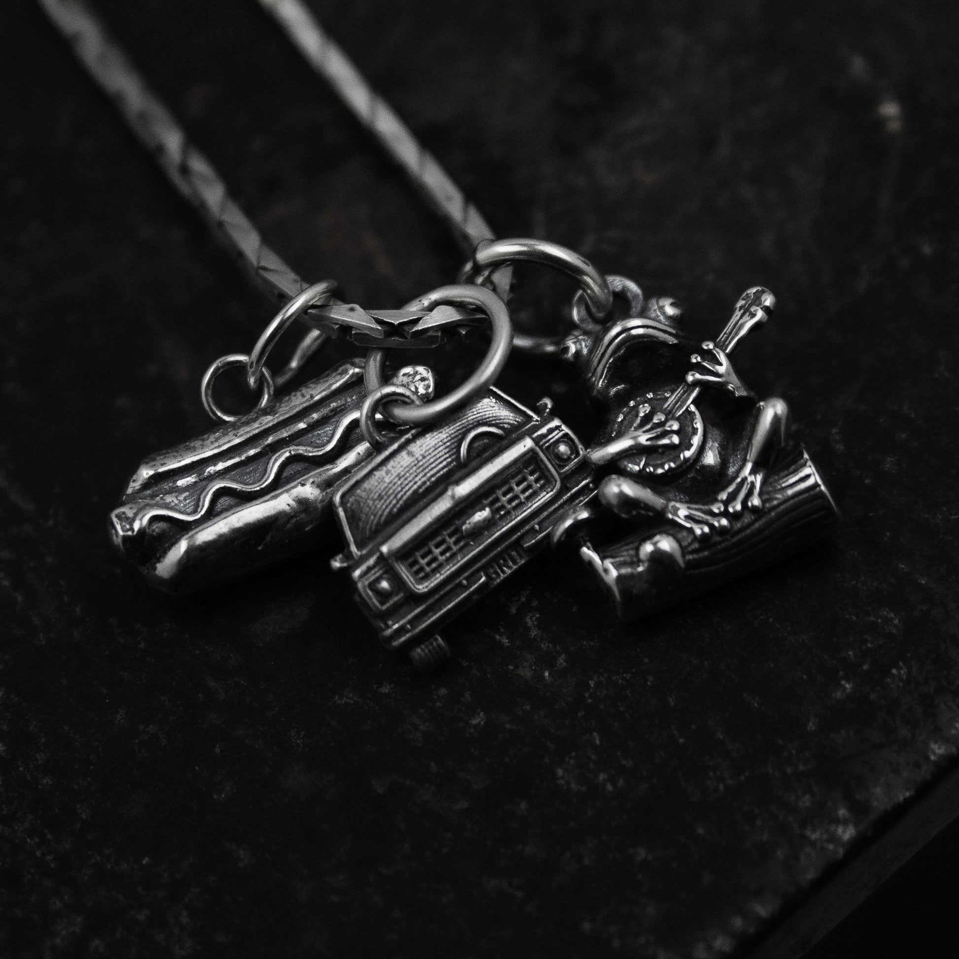 The Americana Charm Collection is now available in Sterling Silver. Pick from the Chevy Squarebody, El Camino, BAD Van, Hot Dog, 8 Ball, Cowboy Boot, Pedal Steel Guitar, Banjo Frog, Eagle and Sacred Heart, Trout, Barbed Wire Heart, Prickly Pear, Agave, Desert Wolf and Horse Head charms available.